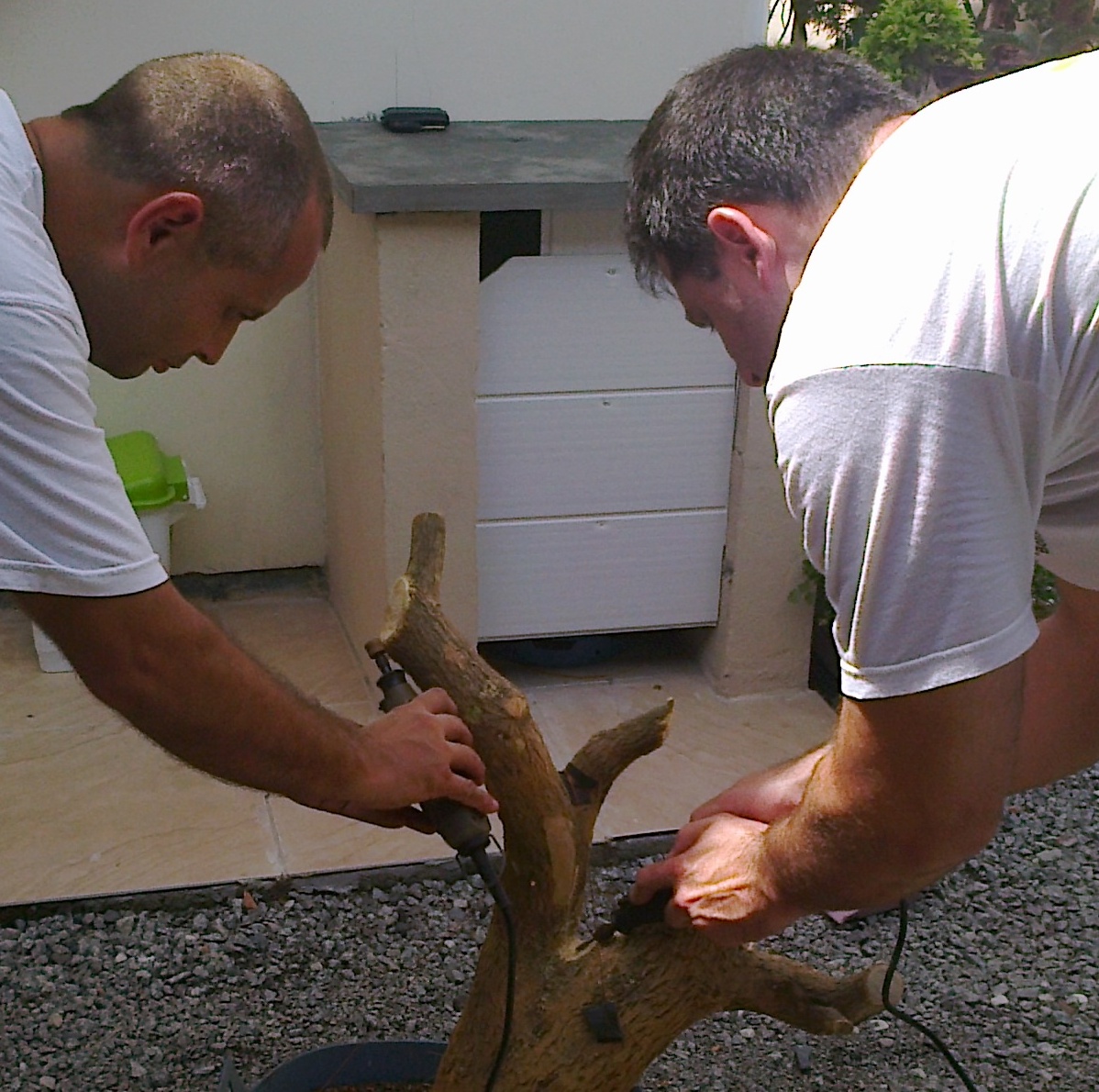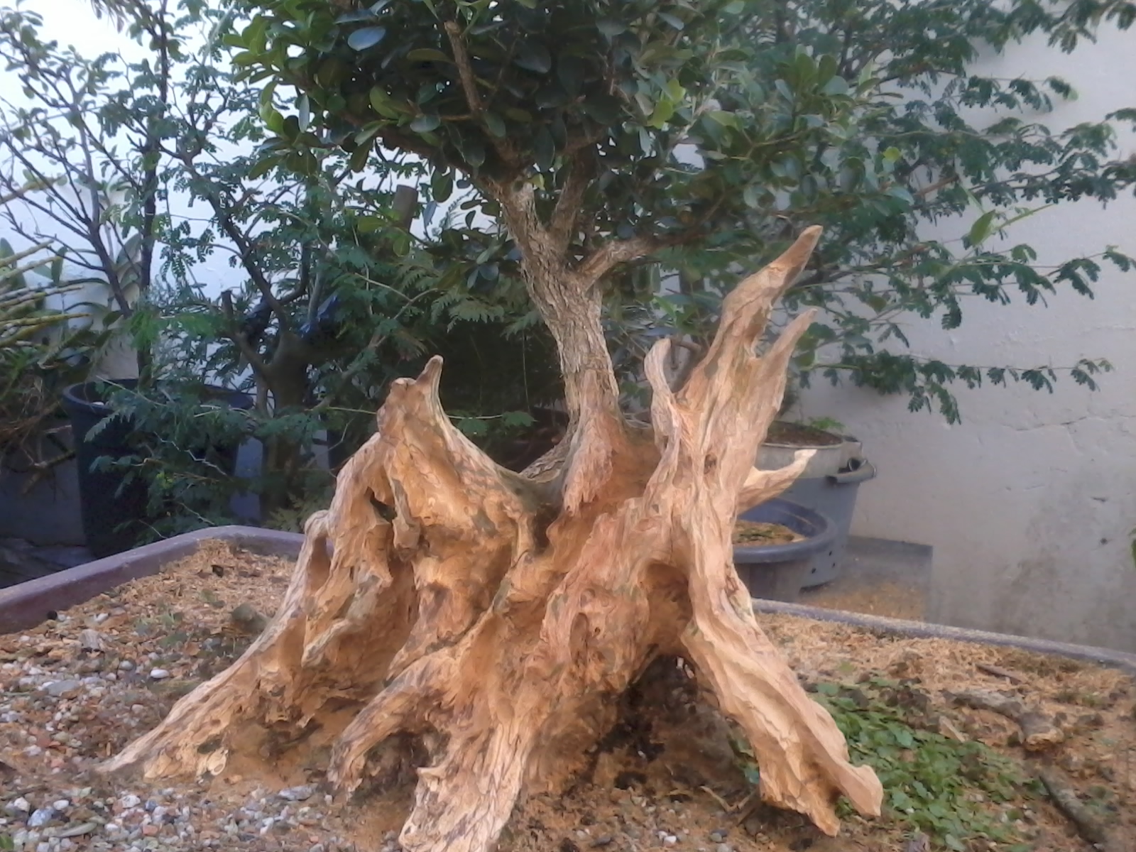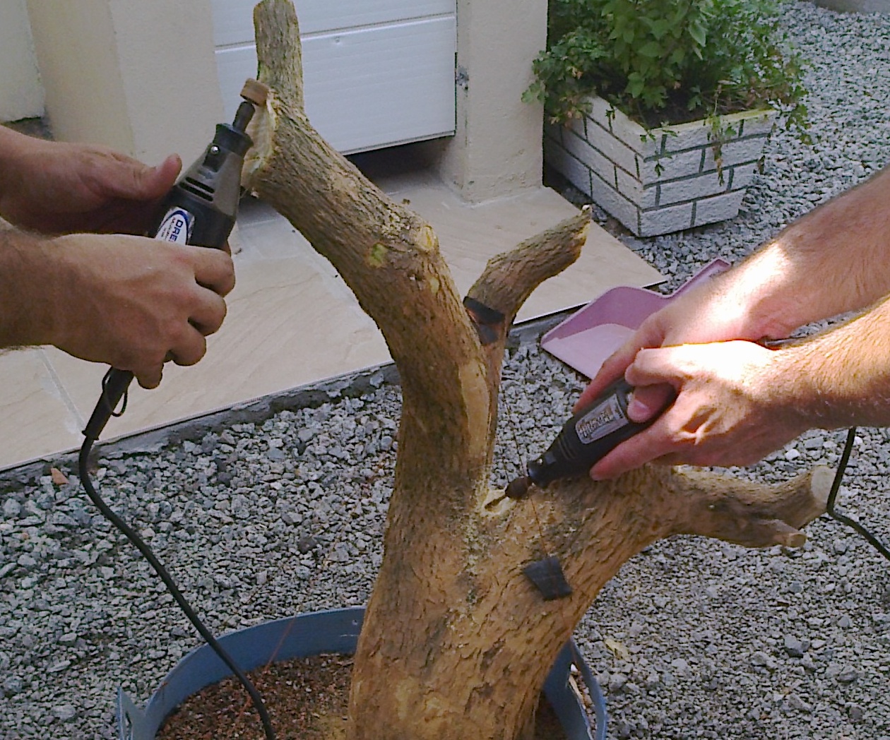 Em julho de 2008 fiz uma boa poda de redução e pensei em trabalho de alguns jin mais longo a princípio, pois depois fica mais fácil cortar do que ficar fazendo enxerto em madeira morta, então foi feito um pré-trabalho de madeira morta com micro-retífica e protegido com calda sulfocáucica depois.