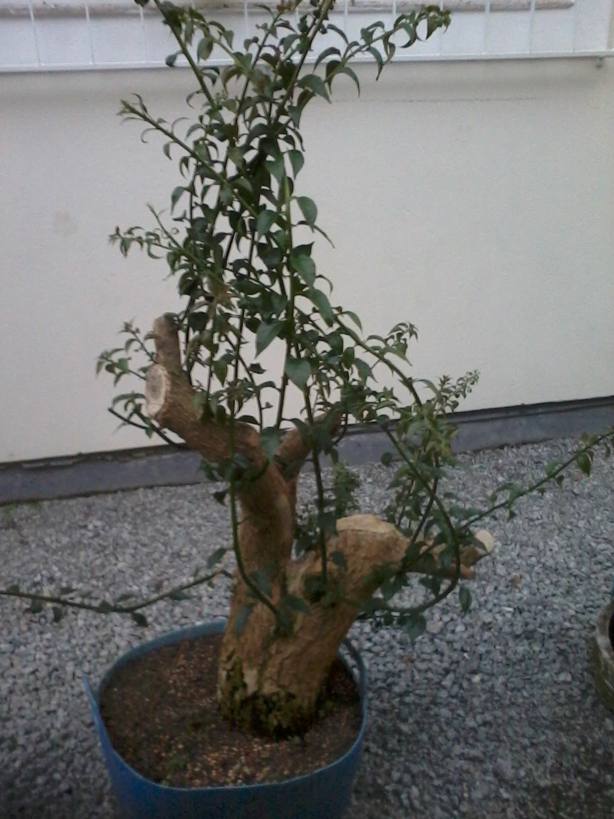 Em setembro de 2009 já vislumbrei algo diferente, uma formação triangular menos equilátera, soltei tudo e recomecei, mas ainda não me agradava o tronco da frente ser tão longo, tão monótono, mas não tinha brotação antes daquele ponto mais na extremidade, esse foi um ponto muito problemático na estilização desta planta, por ser de uma espécie que não aceita bem a poda drástica, na verdade não aceita nunca, então brotações anteriores à podas são praticamente proibidas sob pena de perder o galho inteiro.