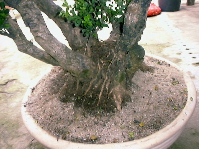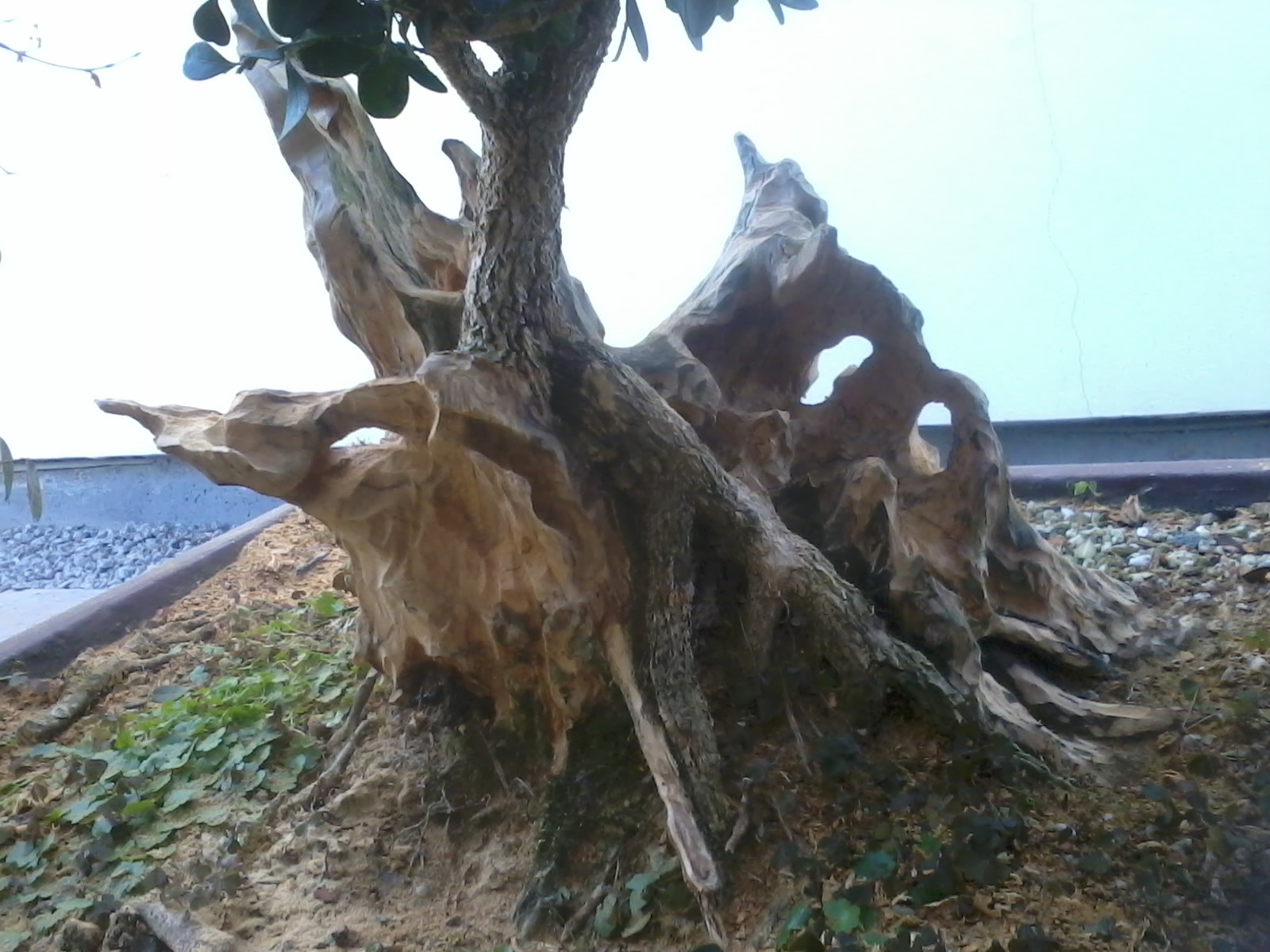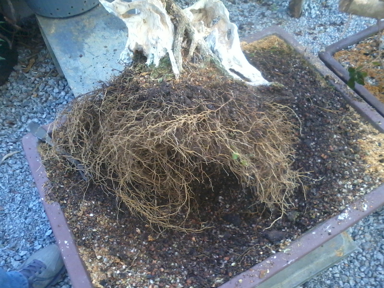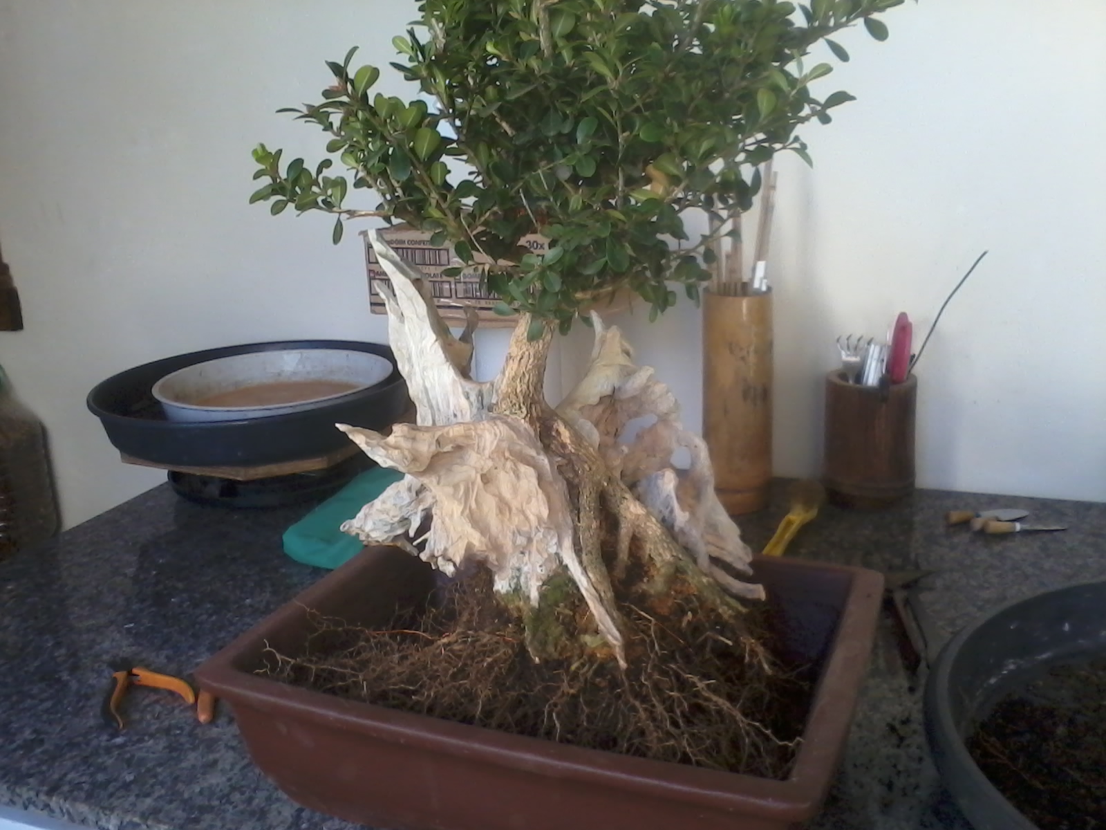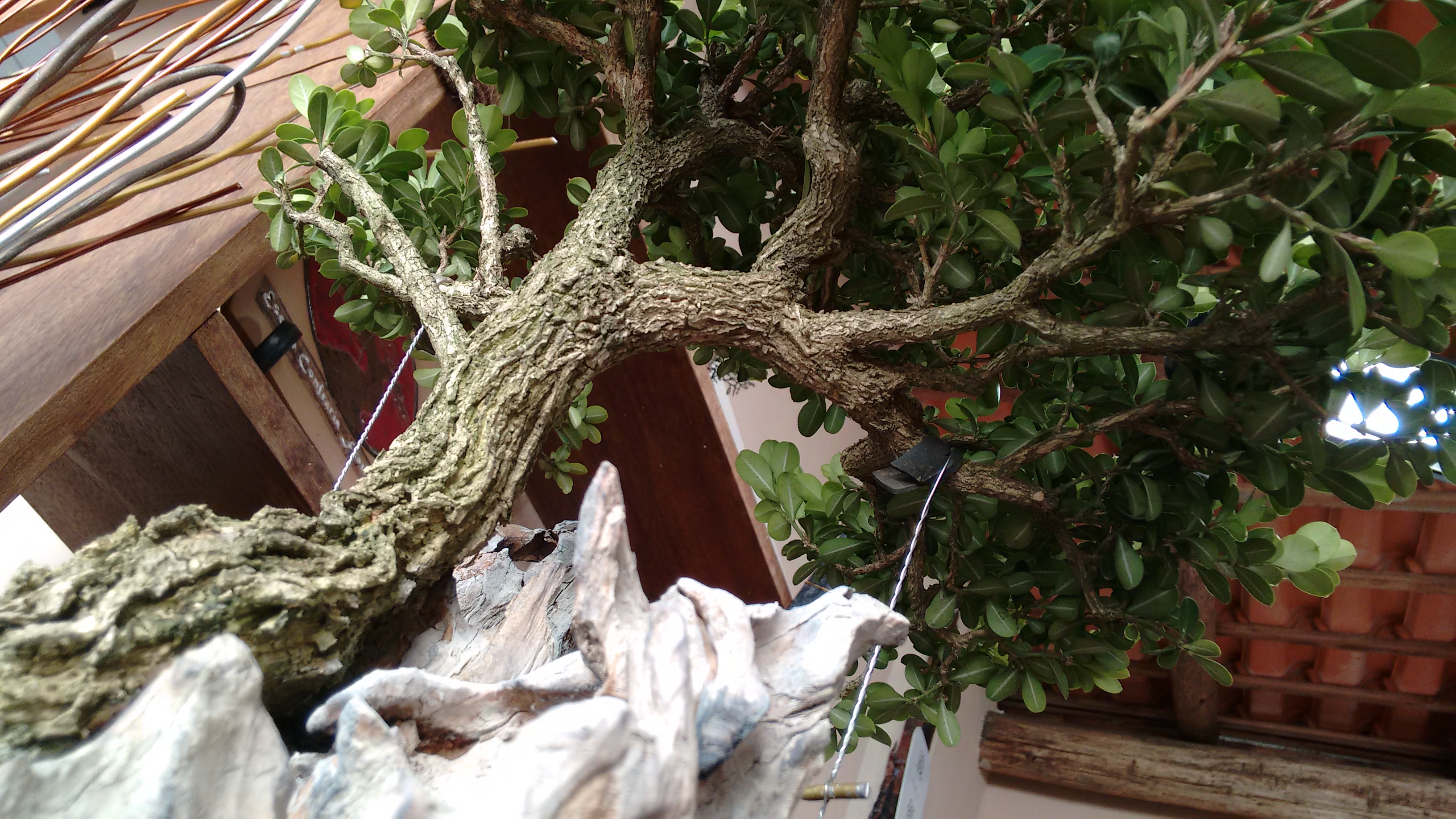 O nebari (raíz externa) era muito aberto, então o aramei com objetivo de ficar mais compacto, mas com uma idéia de usar uma pedra artificial no futuro, fechando as fendase dando uma conicidade à mesma.