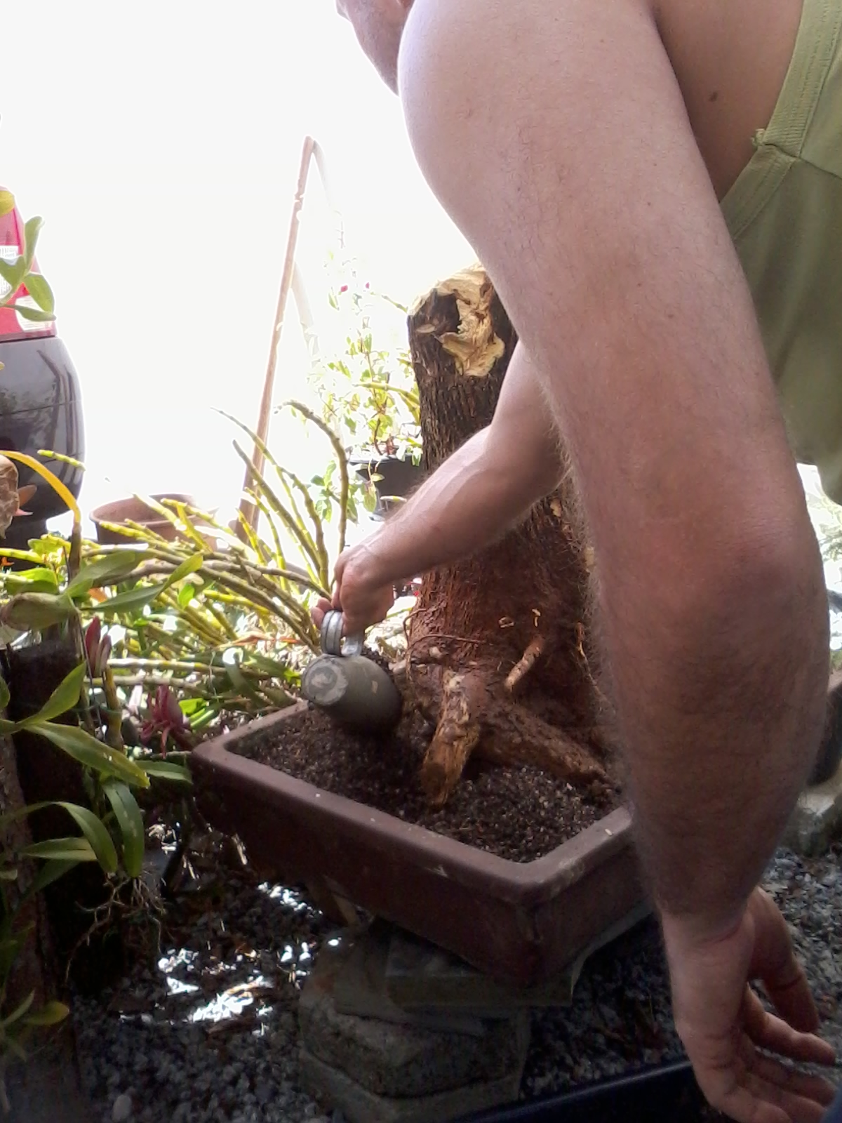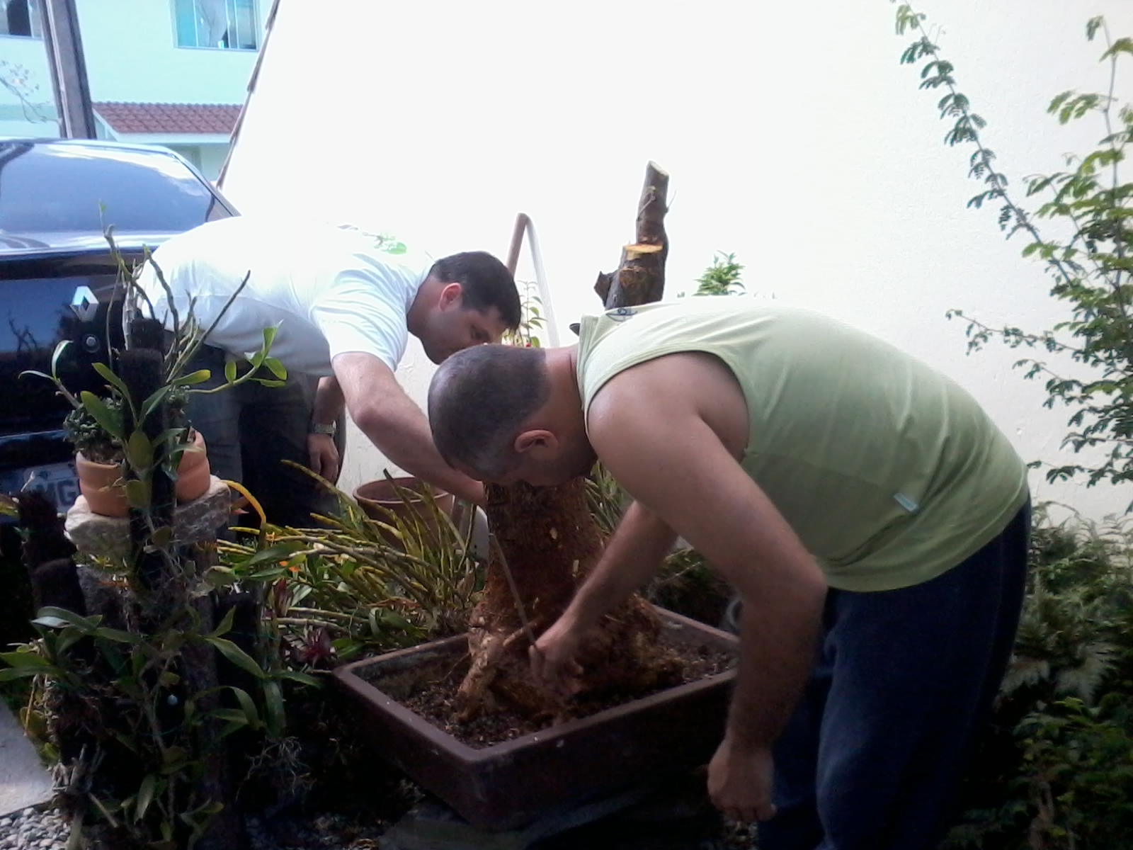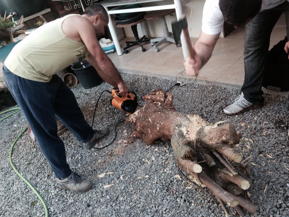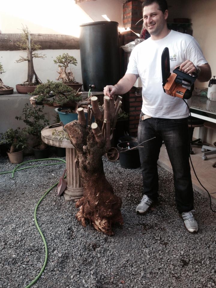 Daqui pra frente começa a aparecer o porque da surpresa e o porque da felicidade nos rostos das crianças depois de ver o movimento de tronco que a menina tinha, uma questão de poda no lugar certo, aproveitando também a conicidade do tronco e a linda base cônica da planta principal! Sim, principal porque tem a poda daquela bagunça toda que se transformou numa planta número dois, que poderia muito bem ser uma planta número um em muitos yamadori por aí… Vamos às imagens: