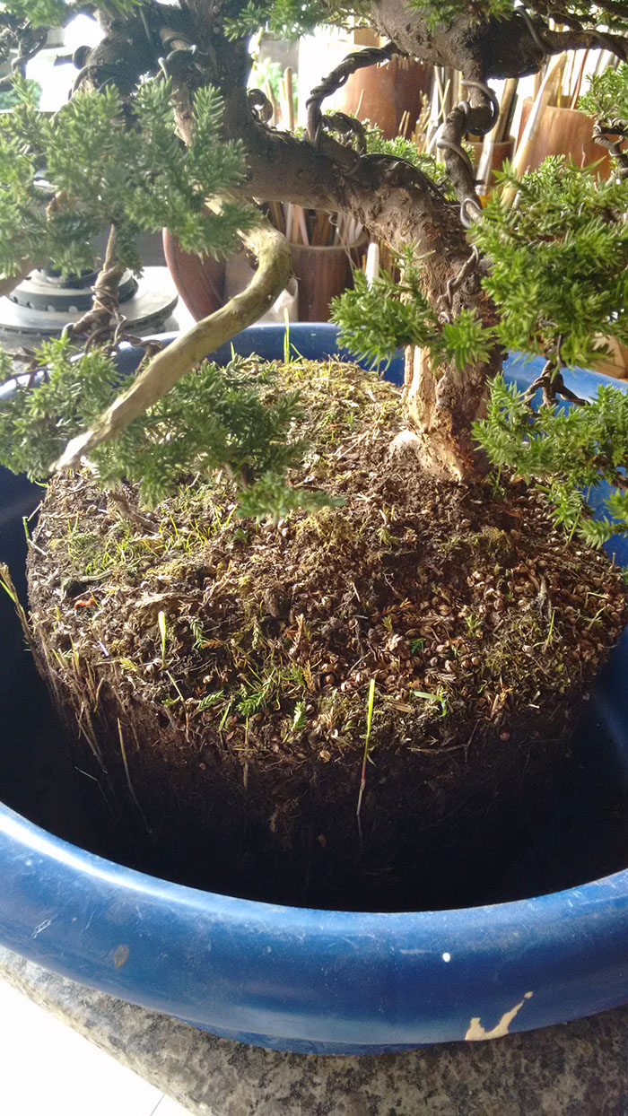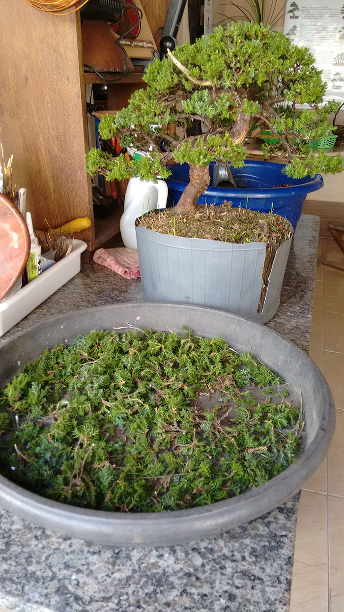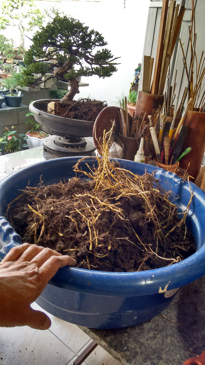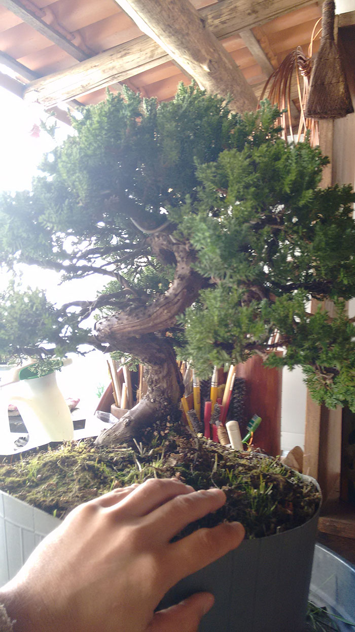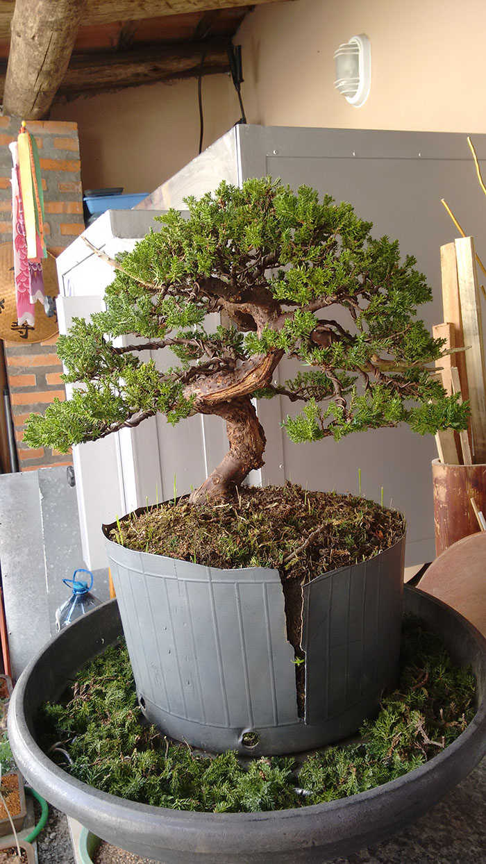 A madeira morta bem sutil, alguns detalhes apenas, pois Daniel não gosta muito, porém eu insisti que juníperos ficam muito interessantes com jin e shari, pois dão mais identidade ao bonsai, no meu ver.